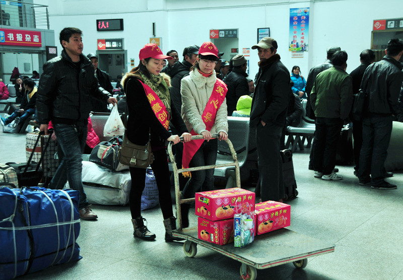 來自揚汽集團和團市委組織的志愿者們有的在進站口向旅客指引車站售票、候車等各個功能區(qū)位置;有的在服務(wù)臺回答旅客咨詢;有的在安檢處勸導旅客把攜帶的物品放上危險品檢查儀安檢;有的推著“雷鋒車”幫行李較多的旅客拖運箱包;有的給候車的旅客倒上一杯熱水;有的在檢票口幫助維持現(xiàn)場秩序,避免發(fā)生擁堵;還有的在候車大廳勸導旅客請勿吸煙……