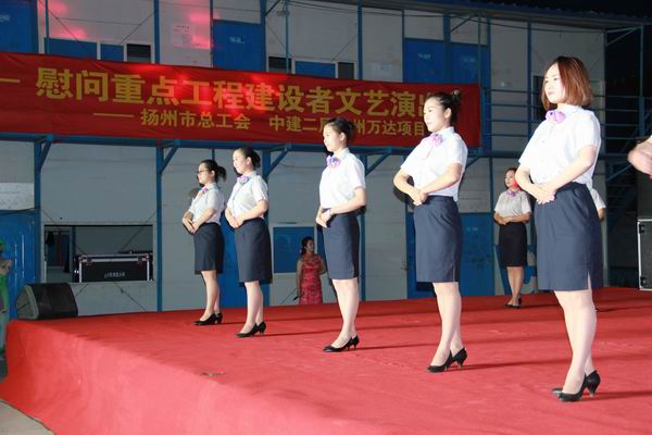 5月3日晚,由揚州市總工會主辦、揚州市建設(shè)產(chǎn)業(yè)工會承辦的“建設(shè)者之歌”——慰問重點工程建設(shè)者文藝演出,在揚州萬達廣場項目部生活區(qū)隆重舉行。我公司參演的《七彩揚汽——員工行為規(guī)范操》得到了在場領(lǐng)導和工程建設(shè)者的一致好評。市總工會副主席洪慧娟,市建設(shè)產(chǎn)業(yè)工會主任田繼榮,市交通產(chǎn)業(yè)集團黨委副書記、紀委書記、工會主席王寧生等領(lǐng)導出席了晚會。
