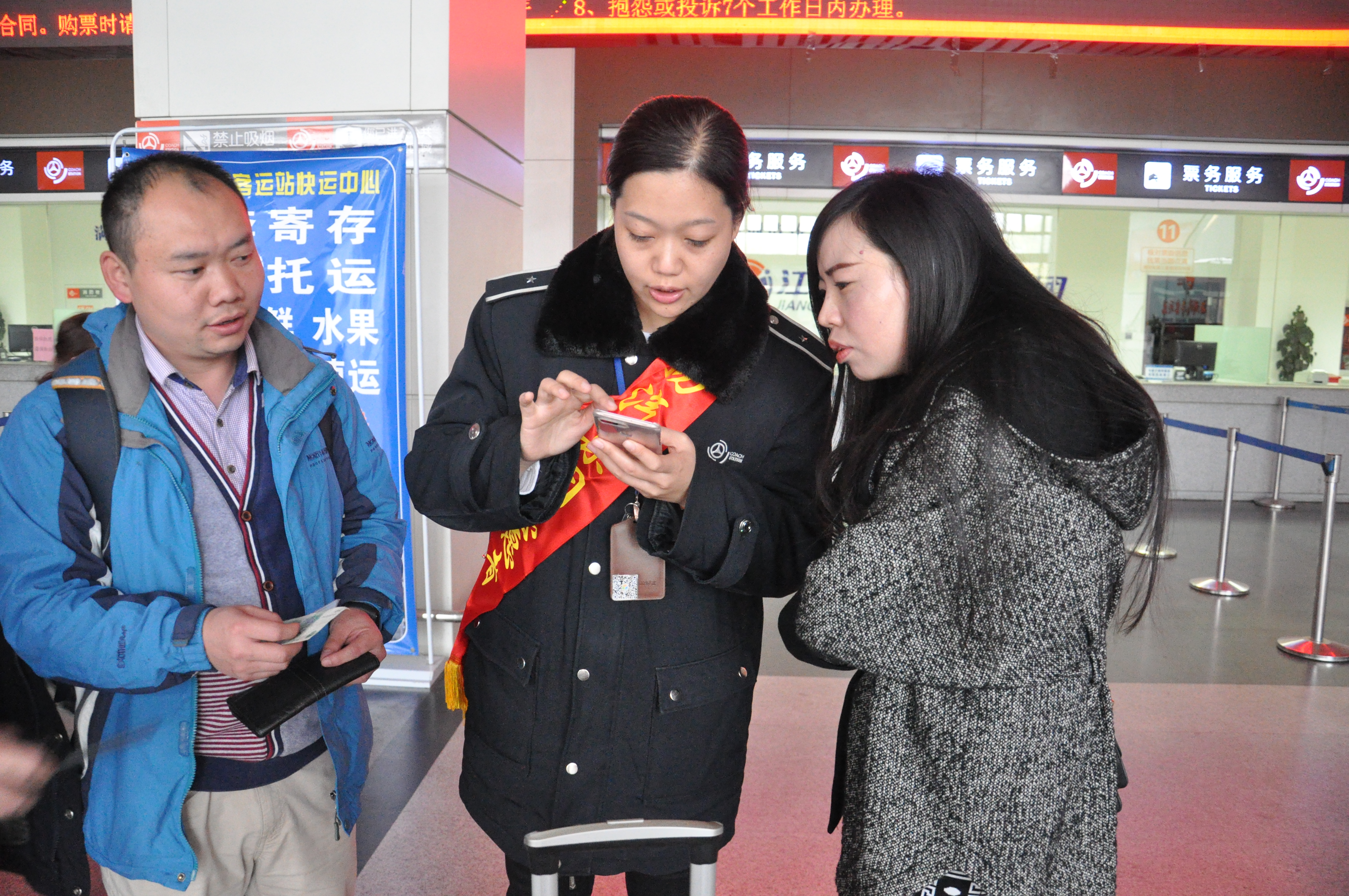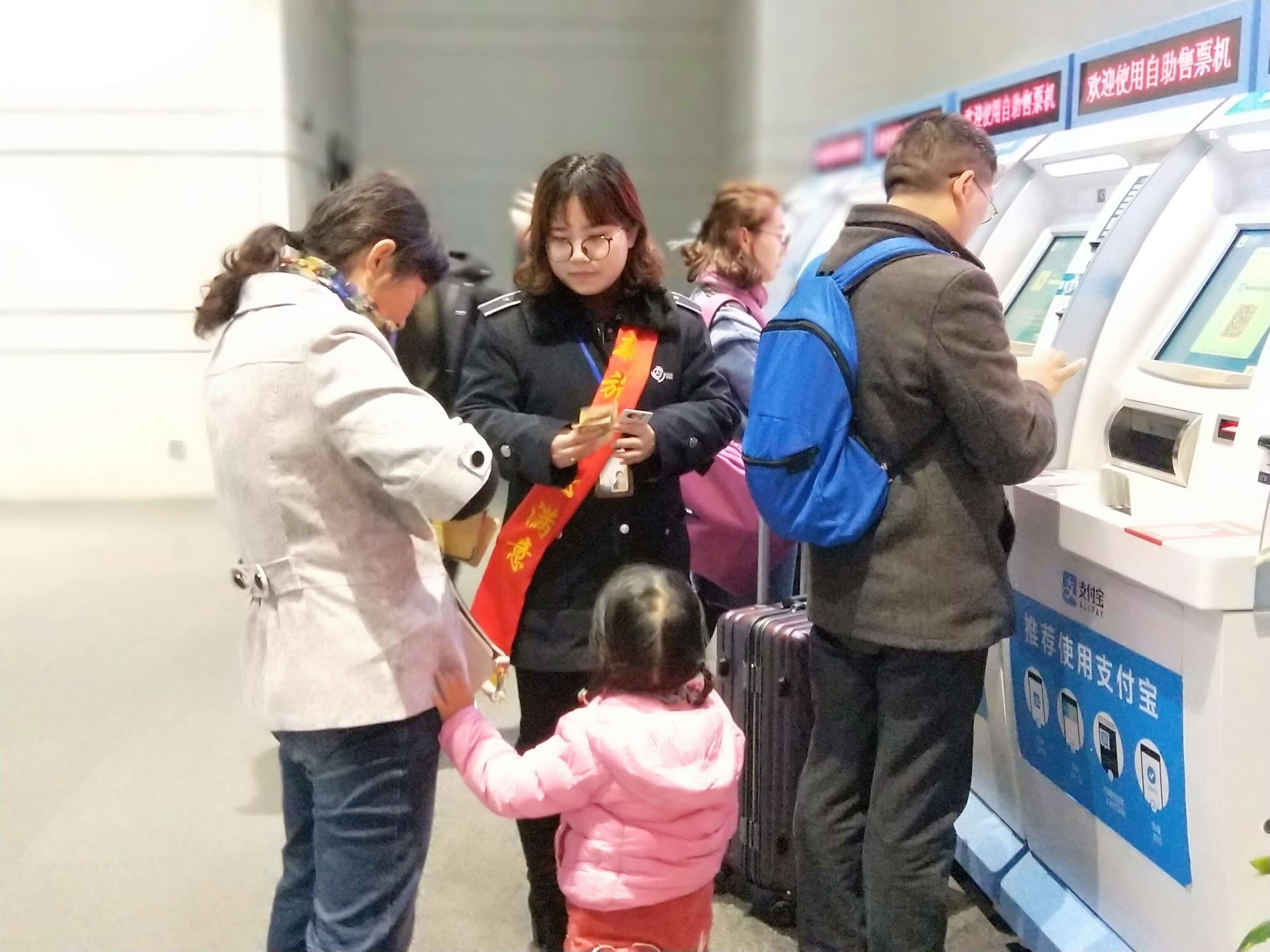 在售票大廳里,有一支身披“新旅途 心滿意”綬帶的工作人員隊(duì)伍,正在有條不紊地引導(dǎo)著前來購票的旅客,通過手機(jī)或者自助機(jī)的形式進(jìn)行購票。原來,車站現(xiàn)場按照站長室近期重點(diǎn)工作的部署,主動在客流放緩的情況下有序進(jìn)行售票自助化、智能化的嘗試。下午3點(diǎn)現(xiàn)場除退票窗口外,其余窗口臨時(shí)停售,售票員紛紛走出售票窗口,將導(dǎo)乘、購票功能前置。