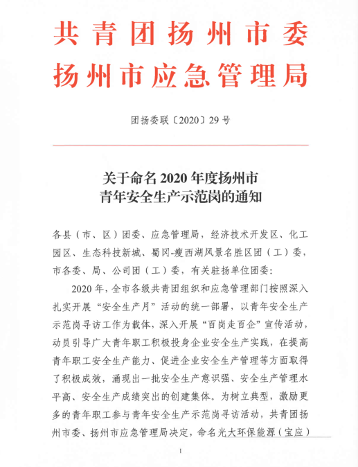 2020年,揚汽集團修理廠維護班切實落實“安全第一、服務第一、質量第一”總目標,以突出的成績,被共青團揚州市委與揚州市應急管理局授予“揚州市青年安全生產示范崗”稱號。