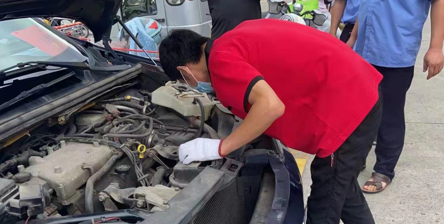 8月14日中午13.00,接到廠部電話通知,因疫情來揚(yáng)州支援的南京公務(wù)車輛因水溫過高而無法行駛停在⻄區(qū)大潤發(fā)停車場 ,得知情況后許學(xué)仁又主動請纓前去搶修,他立即與車主取得了聯(lián)系并向車主詢問車輛故障現(xiàn)象,隨后和同伴馮琪準(zhǔn)備好工具便出發(fā)。趕到現(xiàn)場后,他們對⻋輛進(jìn)行了檢修,從而發(fā)現(xiàn)水箱爆裂導(dǎo)致水溫升高,隨即聯(lián)系配件供應(yīng)商,但因疫情和道路管控原因配件無法送達(dá),許學(xué)仁自己開車去尋找配件,一同前往的機(jī)修工馮琪便開始對水箱進(jìn)行拆解,兩邊同時進(jìn)行著,展開了一場與時間賽跑的“搶修戰(zhàn)役”,當(dāng)回到救援地點(diǎn),水箱以拆解好等待安裝,他倆便開始安裝,裝配完畢后開始試車與檢查水溫,水溫正常且風(fēng)扇完美轉(zhuǎn)動,車輛得已運(yùn)行,他兩露出了開心的笑容。