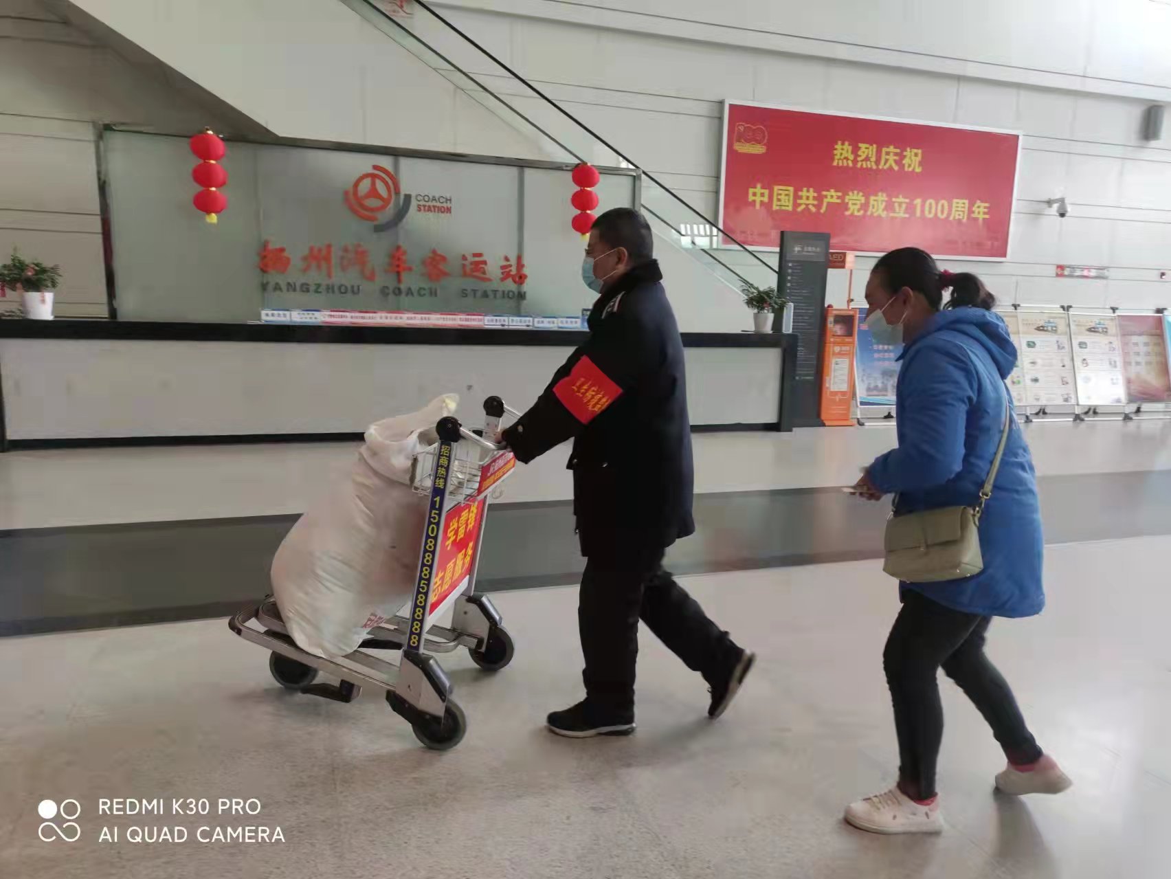 正在巡崗的黃建軍見狀連忙迎上前,了解得知,方女士自小患有小兒麻痹癥,家人在浙江寧波打工,想讓她也一起過(guò)去,好相互有個(gè)照應(yīng)。于是,方女士滿滿當(dāng)當(dāng)?shù)娜艘淮罂诖钣闷,前往寧波與家人團(tuán)聚,尼龍袋子又大又重,方女士拖了一路才來(lái)到車站,累的滿身大汗。