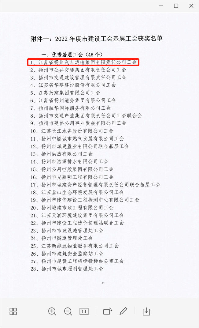 揚(yáng)汽集團(tuán)工會榮獲揚(yáng)州建設(shè)產(chǎn)業(yè)工會“優(yōu)秀基層工會”通報表彰