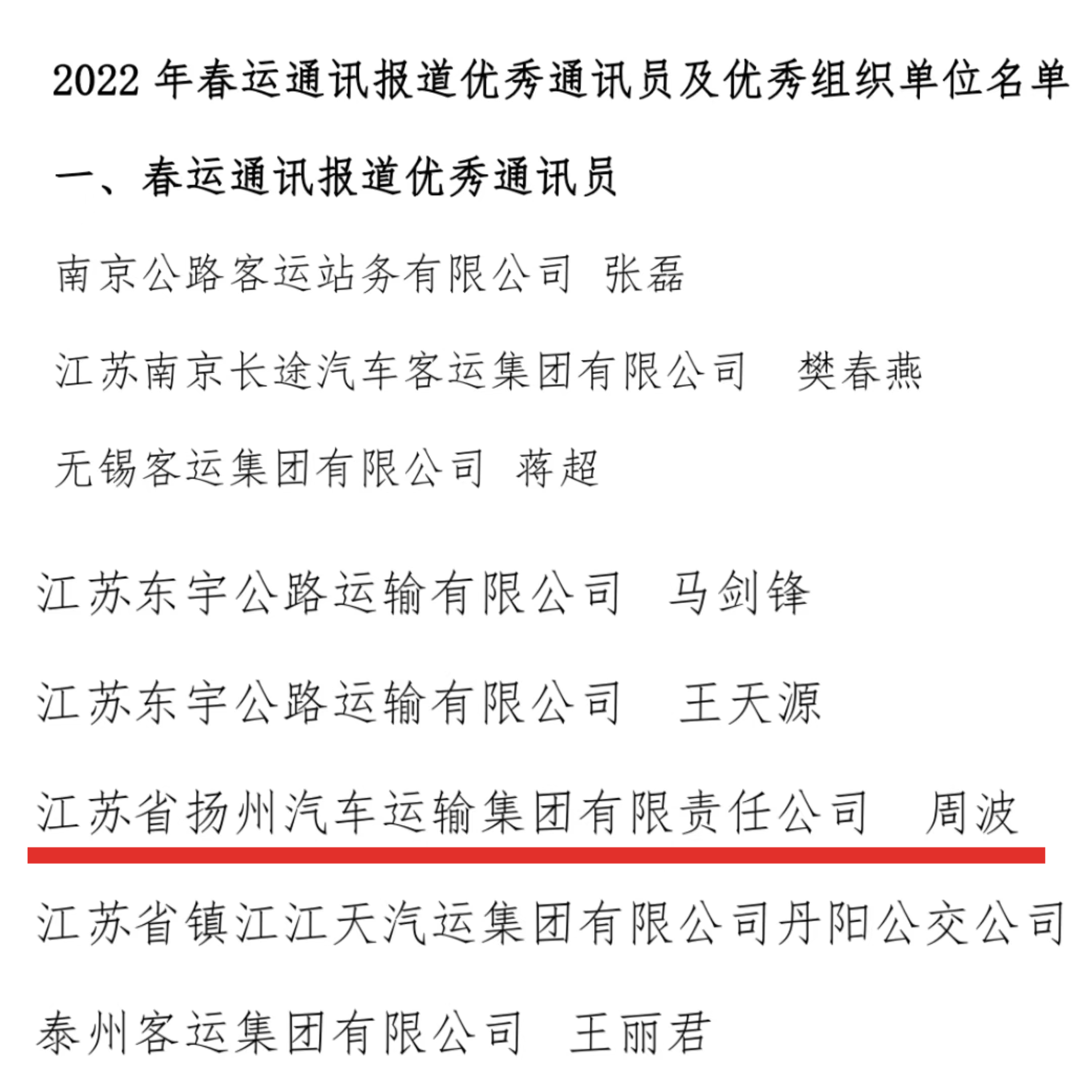 近日,江蘇省交通物流協(xié)會汽車運(yùn)輸分會下發(fā)《關(guān)于表彰 2022、2023 年春運(yùn)報道“優(yōu)秀通訊員”、“優(yōu)秀組織獎”的決定》,集團(tuán)周波獲評“2022 年、2023年春運(yùn)通訊報道優(yōu)秀通訊員”,陳思宇獲評“2023 年春運(yùn)通訊報道優(yōu)秀通訊員”。