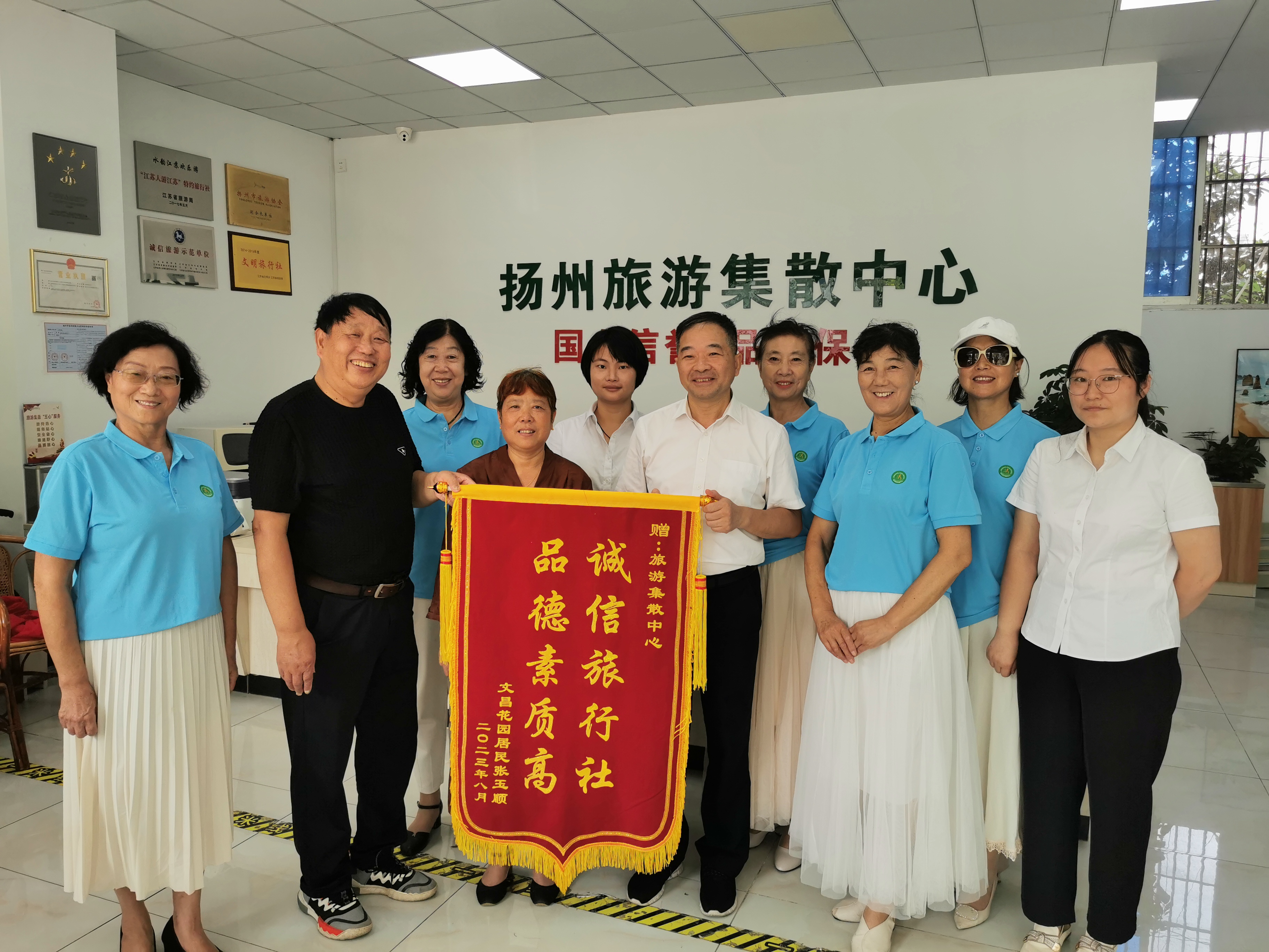 邗江區(qū)的退休老教師胡明碩老先生,因?yàn)槟挲g原因,咨詢了多個(gè)旅行社的旅游線路,都不符合要求被拒,8月中旬,他又嘗試來到旅游集散中心進(jìn)行報(bào)名。相關(guān)部門根據(jù)他的年齡情況,安排專人逐條線路篩選,經(jīng)過細(xì)致選擇后,終于挑選到了他滿意的線路。行程回來后,胡老先生來到集散中心,將帶著他感謝之情的錦旗送到了相關(guān)負(fù)責(zé)人手中。