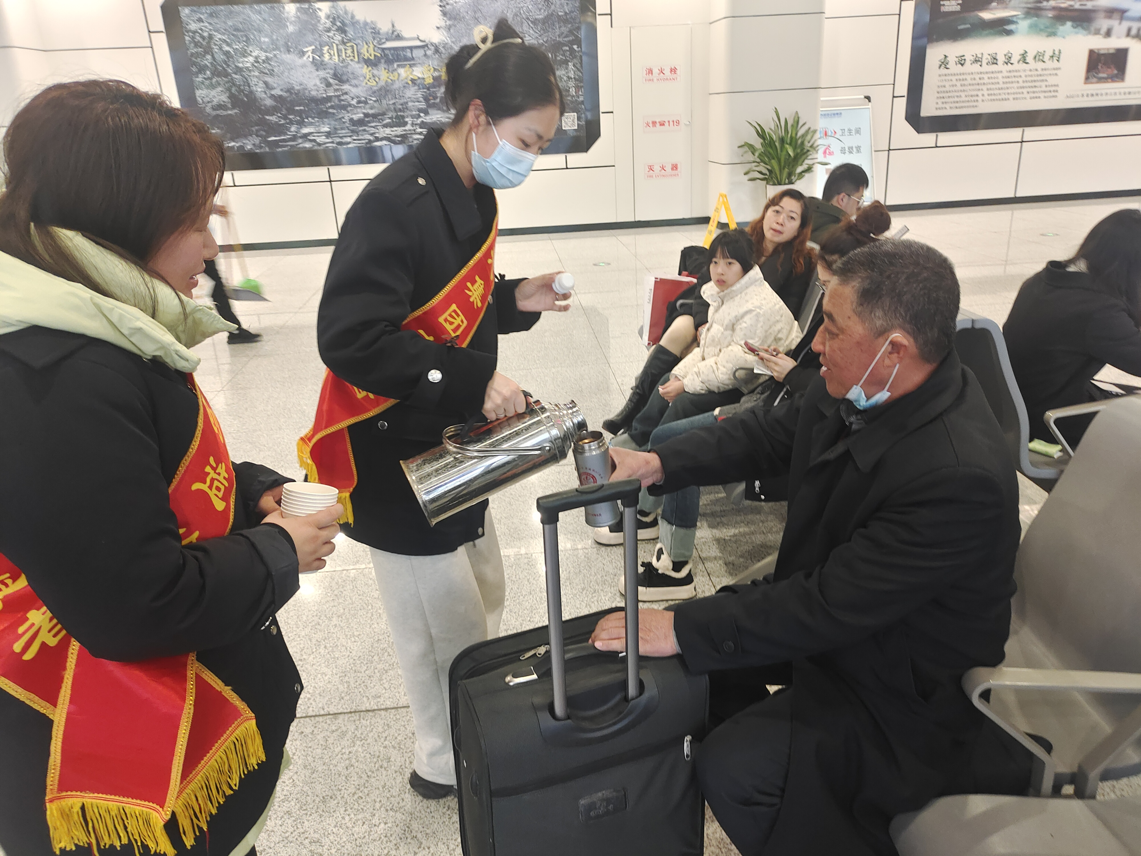 車站將愛(ài)心驛站臨時(shí)調(diào)整為旅客滯留休息區(qū),為旅客們提供了溫暖舒適的休息環(huán)境,工作人員積極與旅客溝通,為大家送上暖心的茶水,及時(shí)告知班次信息,解答旅客的疑問(wèn),努力緩解旅客們的焦慮情緒。同時(shí),工作人員有序地組織旅客退票,耐心地解答旅客疑問(wèn),提供準(zhǔn)確的信息和合理的建議。他們的專業(yè)和熱情,贏得了旅客們的一致稱贊。
