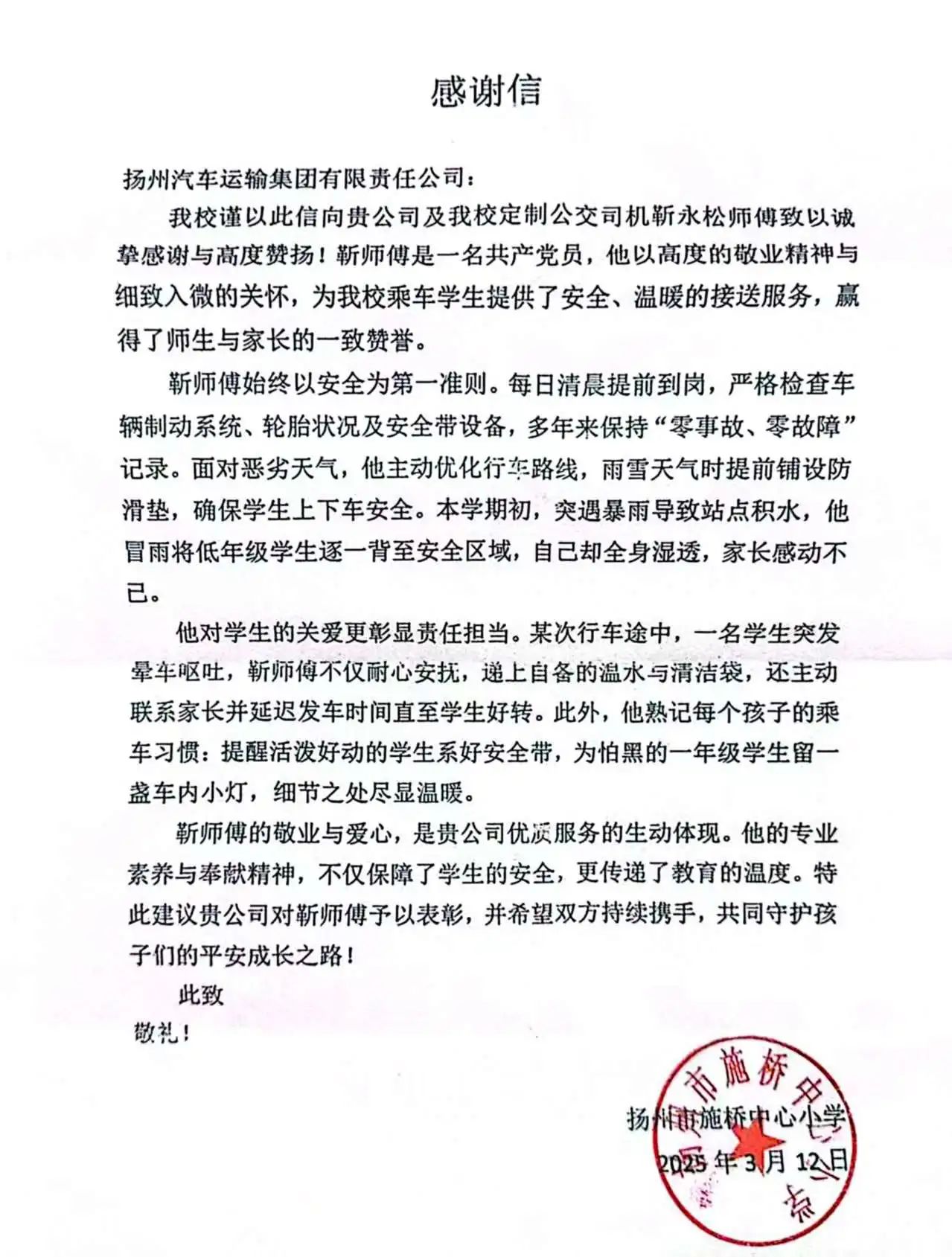 近日,揚汽集團營銷中心收到來自揚州市施橋中心小學(xué)的感謝信,對校車司機靳永松師傅盡職盡責(zé)的安全護送服務(wù)以及對學(xué)生們的悉心照顧表示衷心的感謝。